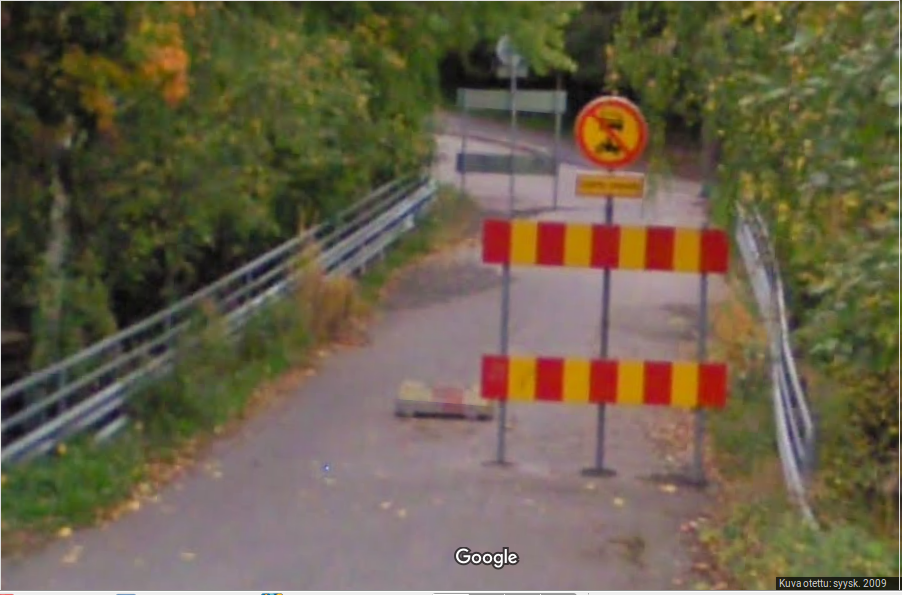 Sama silta(*), mutta seisomalla toisessa päässä eli katsomalla samasta suunnasta kuin rastikuvassakin olisit paremmin nähnyt miten Siljalan polveilee tunnistettavalla tavalla. Itse asiassa tarkoitin neuvoa sinua seisomaan toisessa päässä *virtuaalisesti* mutta nyt hämmästyksekseni huomasin että juuri tätä pätkää Siljalantietä ei Googlen kuvausauto ole ajanut. Vaikka kyllähän siihen syykin selvisi: