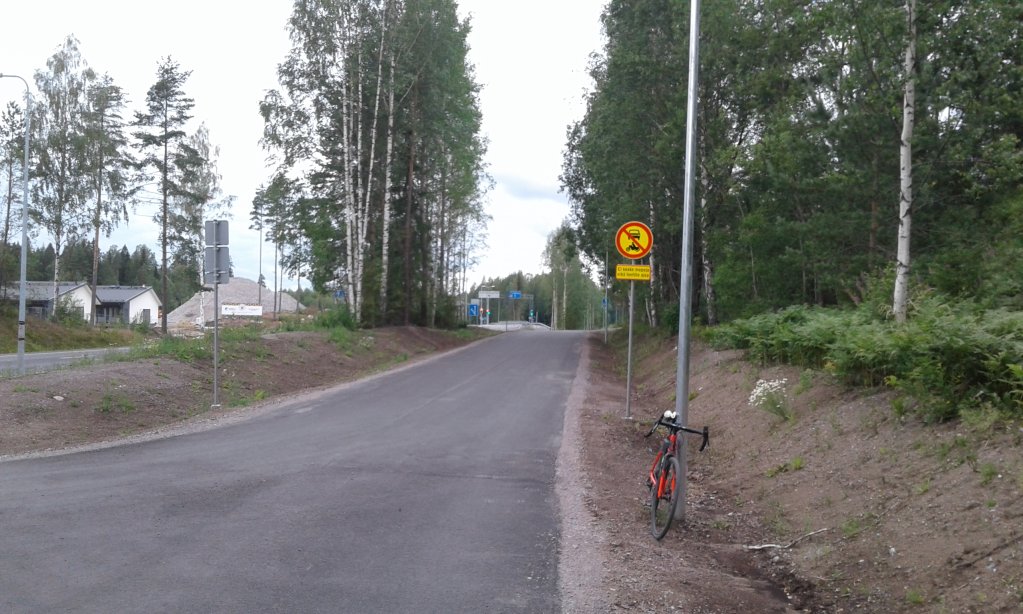 Jos tuosta jatkaisi matkaa fillarin osoittamaan suuntaan, tulisi muistaakseni vastaan alikulkutunneli. Jos kääntyisi, asfalttitie loppuisi. Jos kääntyisi ja kääntyisi vielä oikealle (eli kuvaajasta poispäin), voisi ajaa esimerkiksi kahden ylikulkusillan kautta. Tai olla ajamatta yhdenkään.