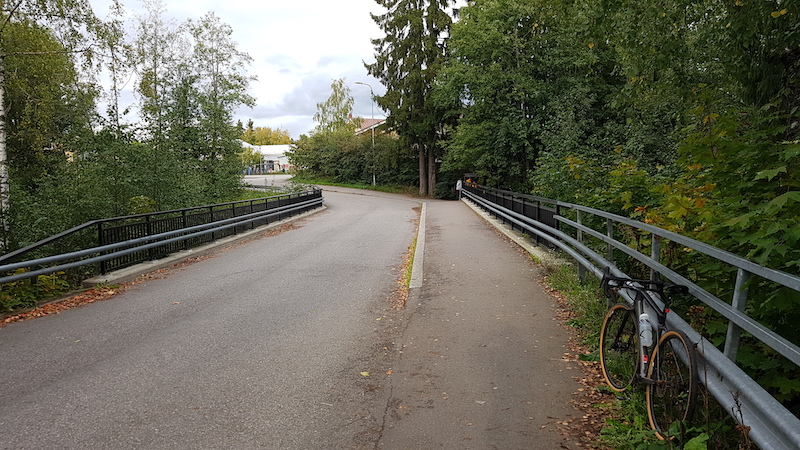 Kovastihan se oli sen oloinen että siinä niin sanotusti kulkee pyörätie, mutta onko Koskensillantielläkään muuta kuin jalkakäytävät molemmin puolin? (Eli on joko ajettava ajorataa tai kierrettävä koko kunnantalo merkittyä kelviä hyväksikäyttäen?)