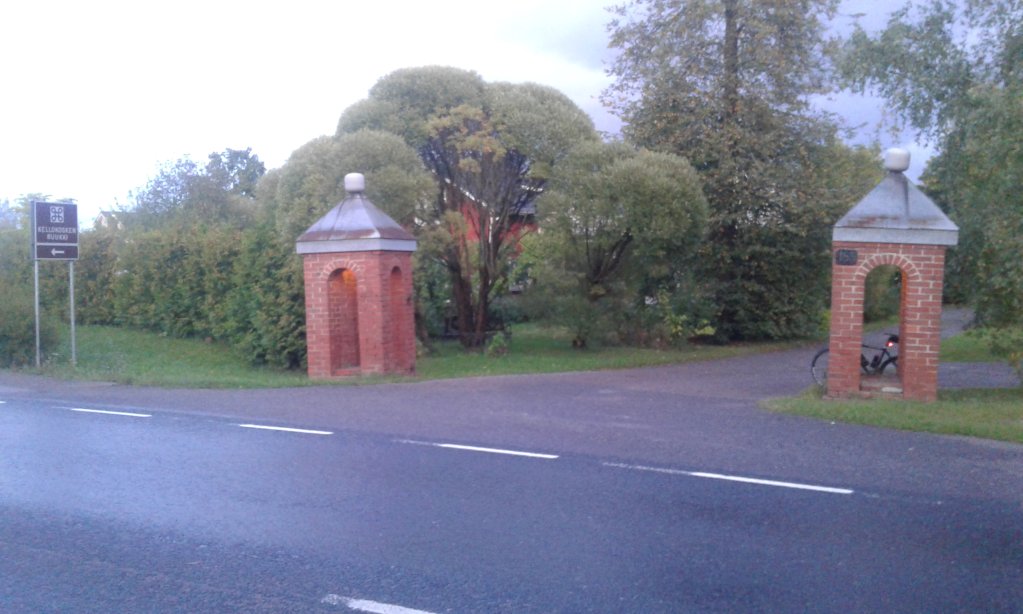 Hain sitten, aikani odoteltuani, rastin 554 Kellokoskelta, Vanhan Valtatien varrelta. Marieforsin ruukin eli Kellokosken ruukin tai sittemmin Kellokosken tehtaan isäntä Totti Carlander suunnitteli tiilirakenteiset porttitornit tai -pilarit vuonna 1933.