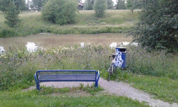 Sinisiä puistokalusteita Keravanjoen rannalla. Rasti 788. Helsingin rasti (toiselta puolen jokea) tuli haettua samalla. Tällä tuplalla ei voi paljoa henkseleitä paukutella.
