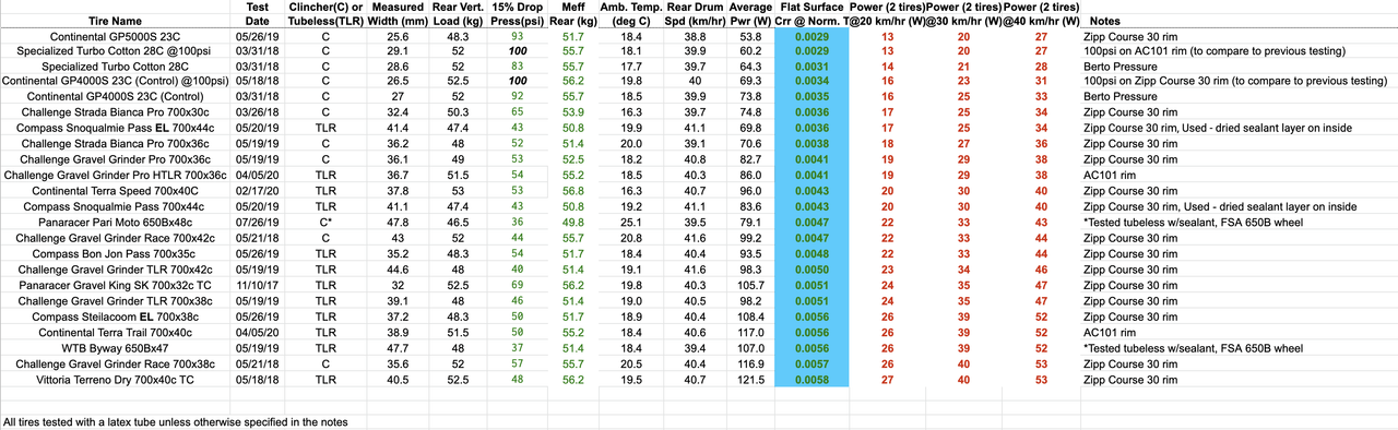 Alla vertailun vuoksi tänne aiemminkin linkattu Tom Anhaltin harjoitusrullilla mittaamat tulokset. Kaikki mittaukset tehty lateksisisurilla ellei muuta mainittu, 15% painaumalla ja 85kg kokonaismassalla. Zipp Course 30 sisäleveys = 21mm.