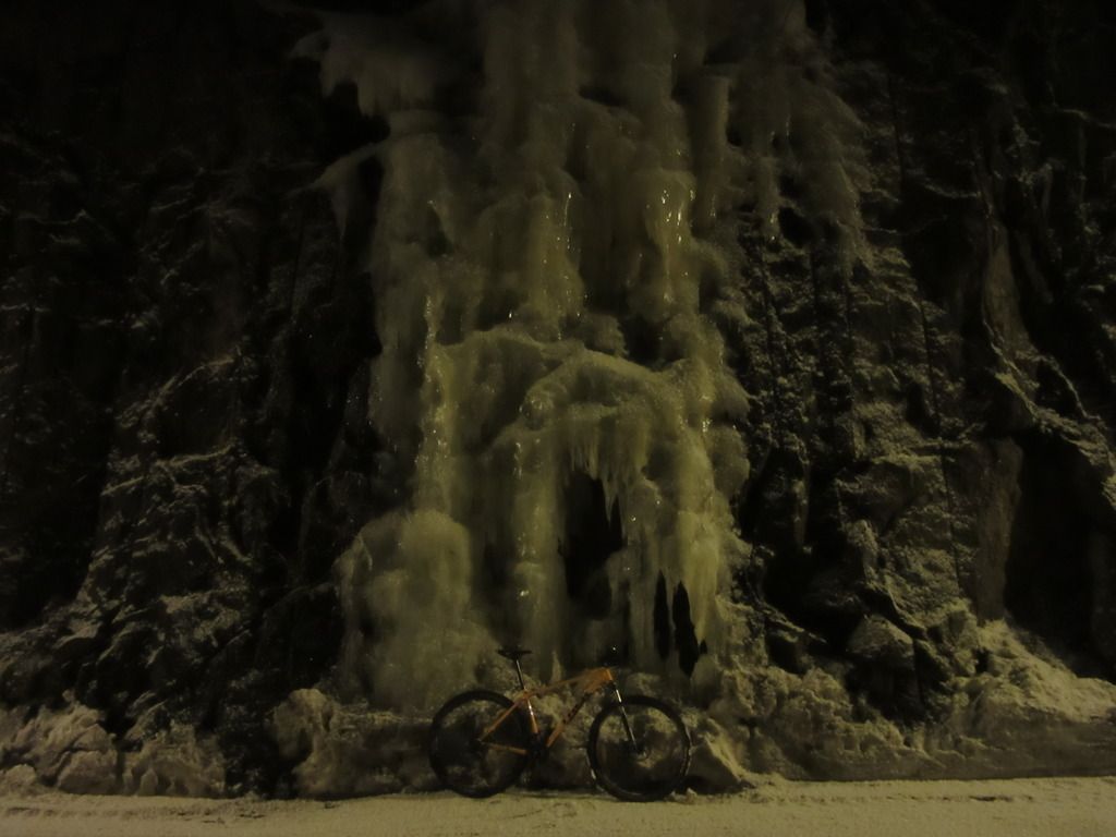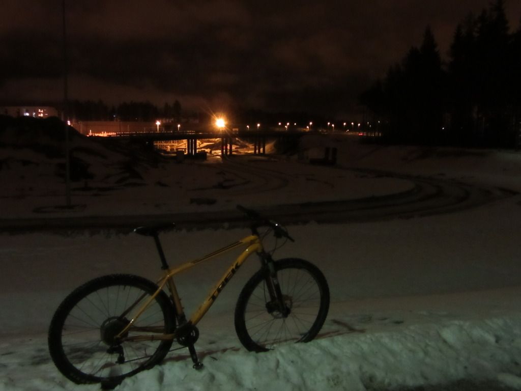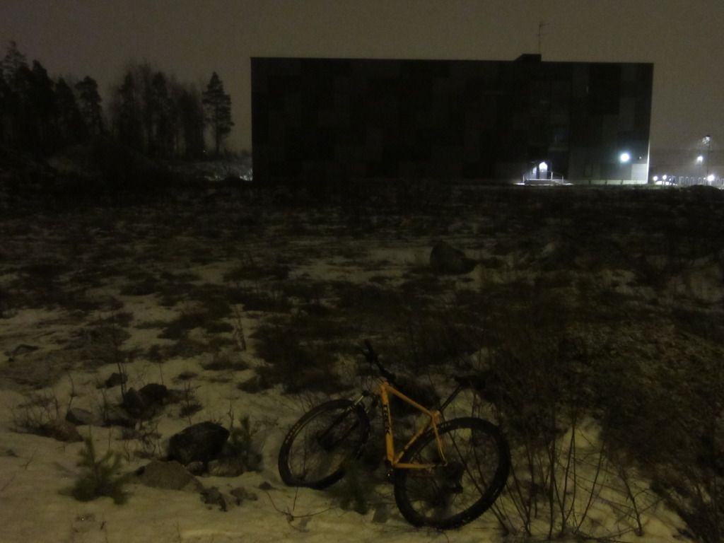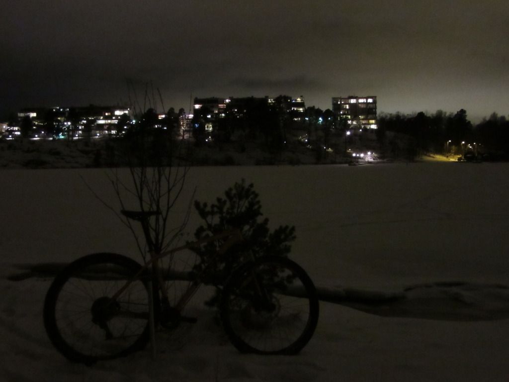 Rastin tuonne viemisestä tuli kyllä jotankin vastuuton olo. Jos tuon hakee, niin ehdottomasti naskalit mukaan. Mielellään myös vaihtovaatetta vesitiiviisti pakattuna. Jäihin saa pudota, mutta hukkuminen ja hypotermiaan kuoleminen ehdottomasti kielletty. Pyörääkään ei mun puolesta tarvitse tuonne roudata jos sen kokee turhan arveluttavaksi. Kunhan saari on oikea. Tarkalla paikallakaan ei ole niin väliä, tosin pyöräni jäljet näkyvät lumessa.