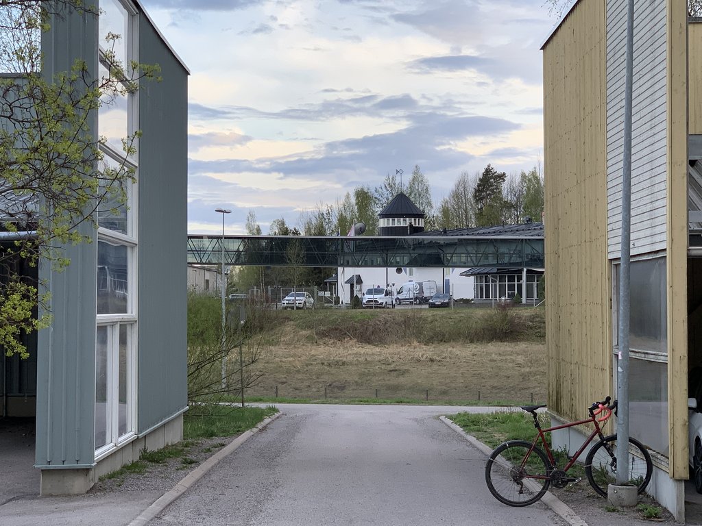 (Keravantien kelviä ajava huomaa tietysti parhaiden uuden studiorakennuksen, mutta koska se ei rastikuvassa näy kuin sen vanhoihin tiloihin yhdistävän käytävän osalta, minut johdatti oikeille jäljille oivallus, jonka antoi tornin kalan muotoinen tuuliviiri.)