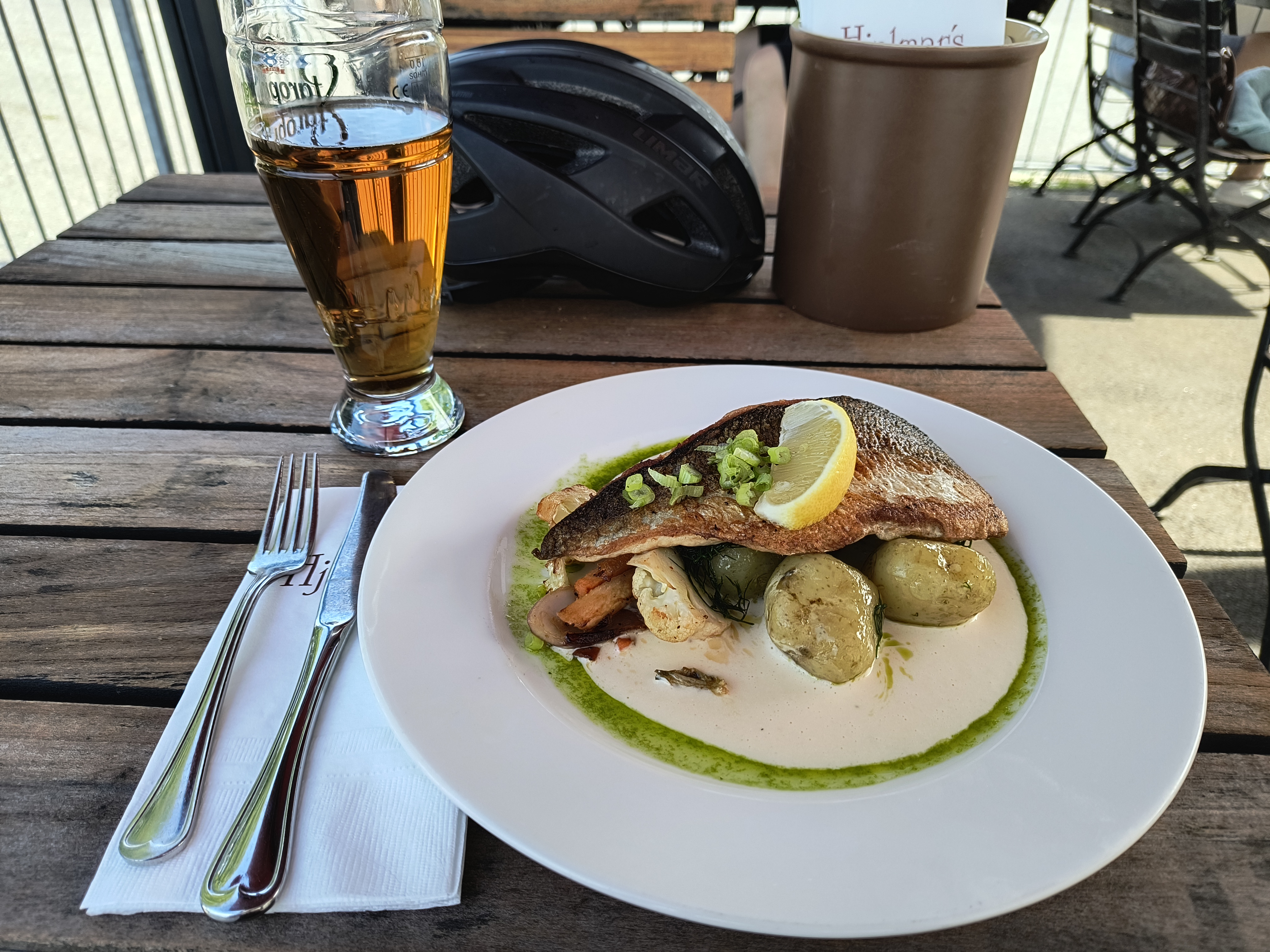 Paistettua siikaa. Lähtikö ne vasta kalastamaan sitä? Vähän on painetta nyt, lautta viiden kilsan päästä lähtee kolmen vartin päästä ja tossa kaupassakin pitäisi ehtiä käydä.