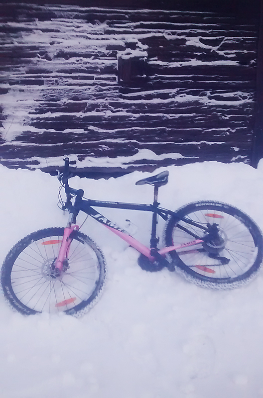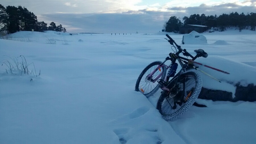 Kävin aamulenkillä tutkimassa paikkoja, mutta lumisokeus yllätti pyöräilijän. Oli rantaraitti aika raskasta ajettavaa Ice Spiker Prolla, vaikka matalilla paineilla ajelen.