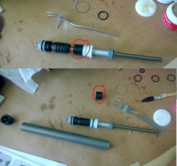 Pähkäilin tuossa voiko tuon spacerin poisto aiheuttaa jotain ongelmia ja ainoa mitä keksin, on jos tuo paluuvaimennuksen sylinterin tanko on lyhyempi kuin ilmapuolella, jolloin haarukka voisi pohjata siihen. En toki tajunnut ajoissa mitata tuota, mutta kasaan laittaessa matka kasvoi spacerin poiston olettaman 20mm, joka viittaisi edelleen normaaliin toimintaan.