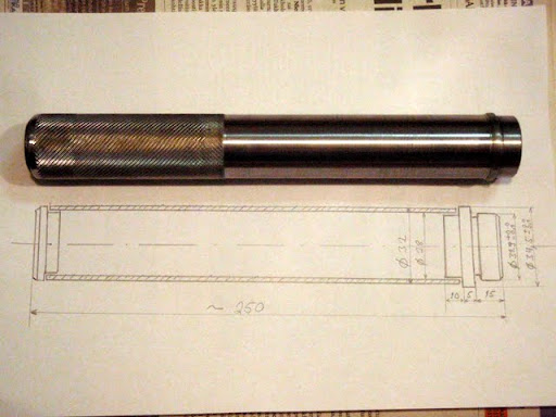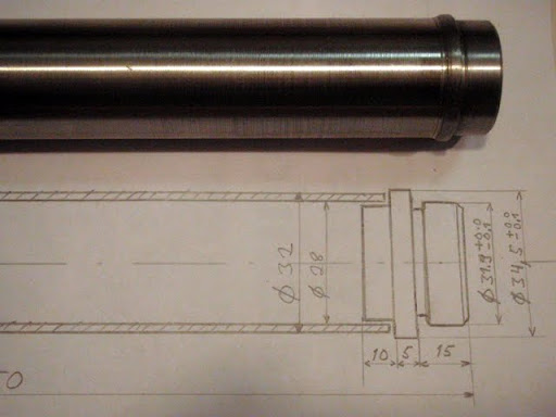 Totta, asennus ei onnistu millä tahansa hylsyllä hakkaamalla jos meinaa että holkit säilyy ehjänä. Väsäsin työkalun holkkien vaihtoon. Operaation aikana, jota etäohjattiin Tampereelta käsin;), selvisi että Reban alemman holkin asennustyökalu ei kärsi olla paksuimmalta kohdaltaan yli 34.50mm, sillä Rebassa on noin puolessa välissä jalkaa ahtaampi kohta jonka ohitse työkalun pitää mahtua. (fox:iin menee 34.90mm) Työkalun voi tehdä myös umpijöötistä, mutta kevyempi tulee putkenpätkästä hitsaamalla päihin tulpat. Ohessa kuva ja mitat TSI rakentelijoille.