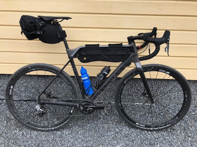 Ortlieb 16 l seat pack, 4 l frame pack ja S-koon tankolaukku. Topeakin top tube bägissä kännykkä ja powerbank. Tankolaukussa on kiinni makuualusta parilla Sea To Summit remmillä. Teltta matkaa tankolaukussa. Frame bagissa ruokaa ja eletroniikkaa sekä pyörän korjausvälineet. Satulalaukussa vaihtovaatteet, makuupussi, retkityyny ja hygieniabägi. Johonkin täytyy vielä saada ängettyä kaasu ja kattila, jos meinaa keitellä kahvit ja ruuat. Jos ilman reppua meinaan reissata siis. Varmaan kokemuksen kautta tulee pakkaamiseen järkevyyttä.