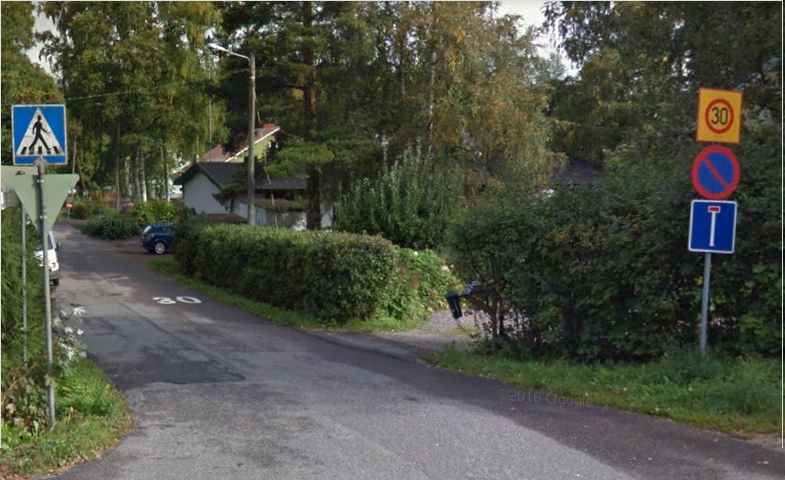 Pyöräilyn ja kävelyn reittiopaskin tuntee tuon lähinnä polulta näyttävän pyörätien. Valitettavasti en voi varmasti mennä sanomaan miten asianlaita on nykyään, mutta Googlen vuosia sitten ottamassa kuvassa kadun ja lähimmän normaalimman kevyen liikenteen väylän risteyksessä ei päättyvän tien merkin lisäksi ole pyörätien jatkumisesta kertovaa merkkiä: