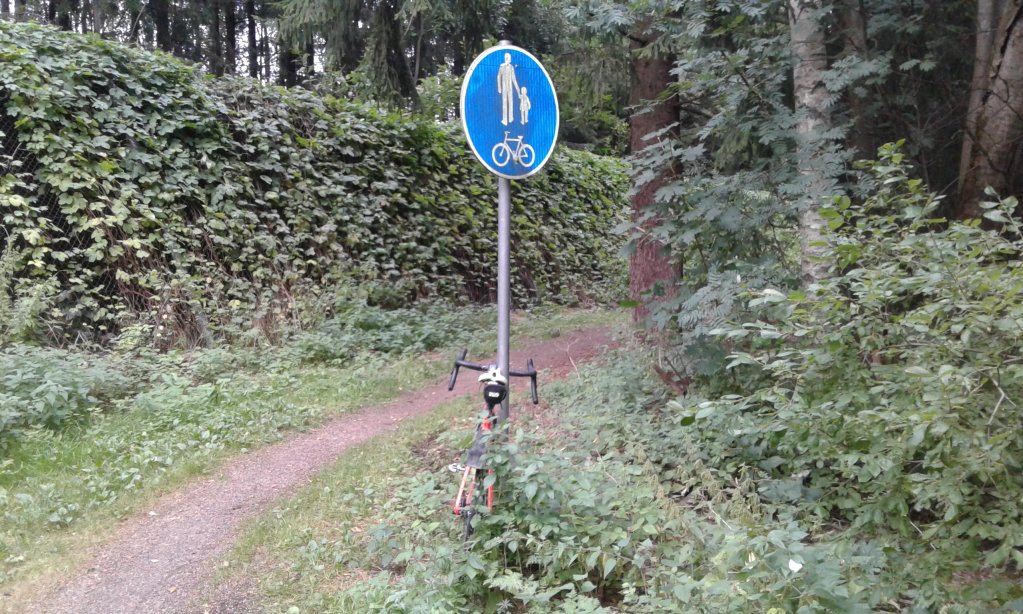 Juuri ennen kuin nousin gravelrakettini satulasta ja asetin sen nojaamaan kuvauksellisesti liikennemerkin tolppaa vasten olin kieltämättä ajanut ajoradalla - mutta täysin laillisesti sillä kyseessä oli pyöräilyverkon osana toimiva vähäliikenteinen katu tai tie.