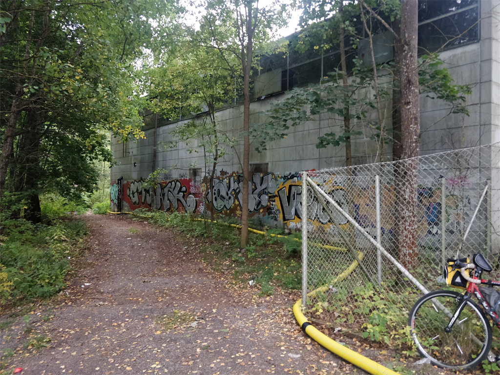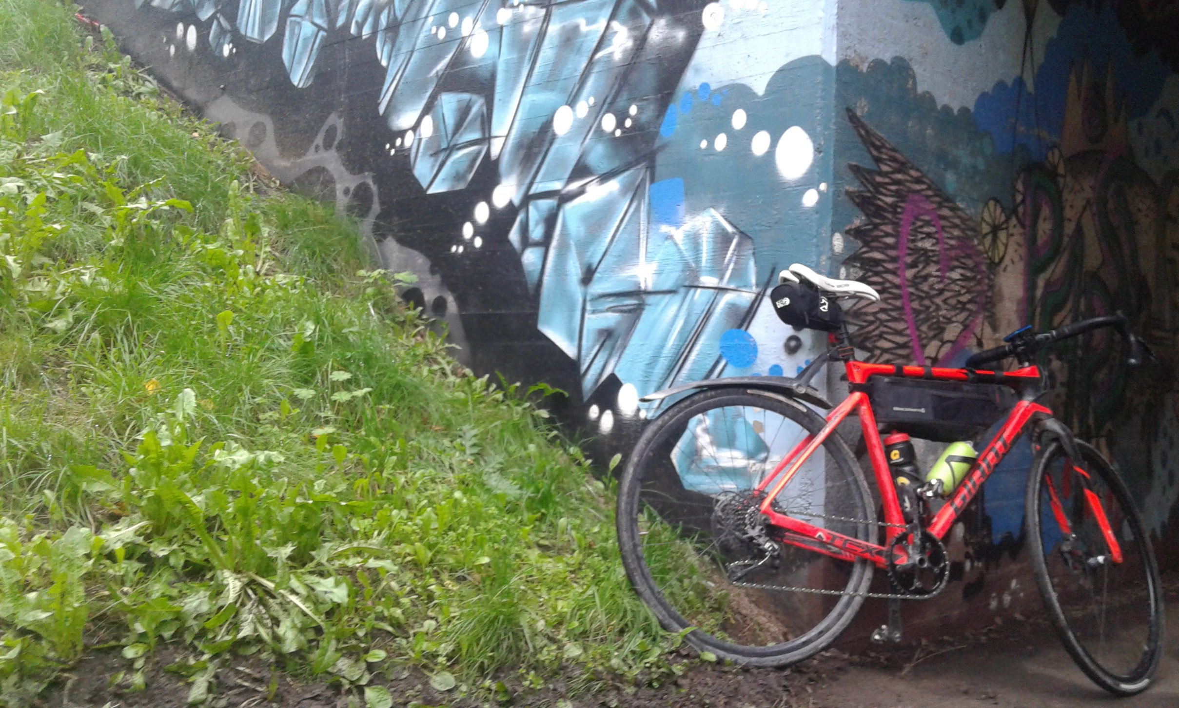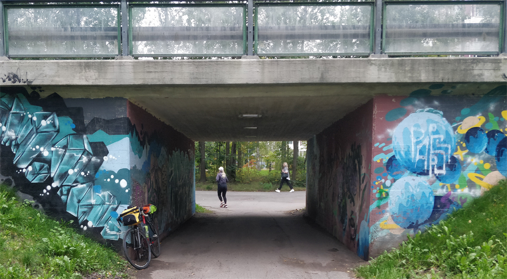 Koska erehdyin kuvittelemaan että rasti ilman muuta haettaisiin jo seuraavana päivänä, en älynnyt ottaa etäämpää sellaisia kuvia joista näkyisi ympäristöäkin enkä oikein osaa kuvata paikkaa sanallisestikaan. Ymmärtääkseni tämän alikulun kautta kuitenkin ajetaan varsin paljon ja vaikka tässä ollaan vielä asfaltilla, monella lienee menossa gravel-lenkki eli ollaan ajettu hiekalla puiston kautta ja jatketaan kohta taas hiekalla metsikön läpi (tai päinvastoin).