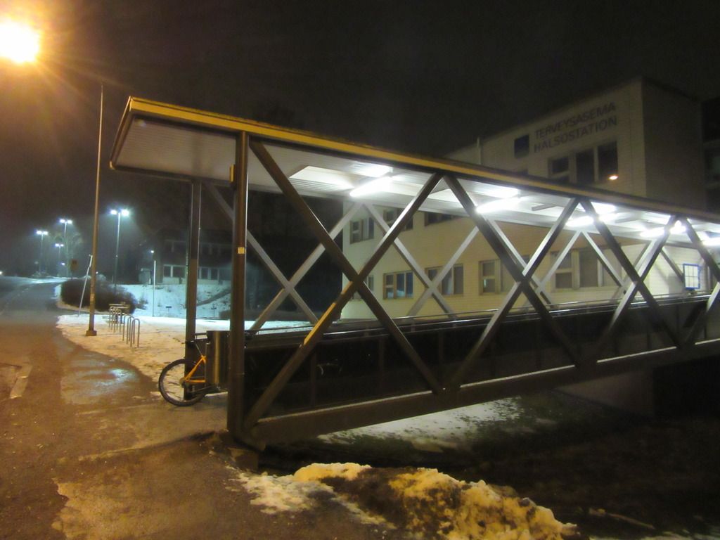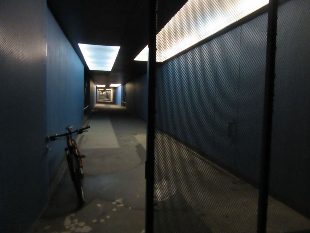 Pääsi sieltä portaita ylös, hissiä ei uskaltanut kokeilla. Merkitty jalankululle, vaikka reittiopaskin ohjaa pyöräilijän tuonne, niin pitäisi taluttaa portaat ja 280m käytävää.