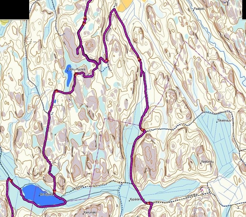 Olin etsimässä uusia uria ja jotain myös löysin. Kuvassa suurimmalta osaltaan ihan ajettava uusi pätkä reitiltäni. Tuolla Pikku-Kypärän paikkeilla törmäsin toiseen läskeilijään ja eihän noilla seuduin kukaan muu voi ajella kuin eräs ikinuorukainen...