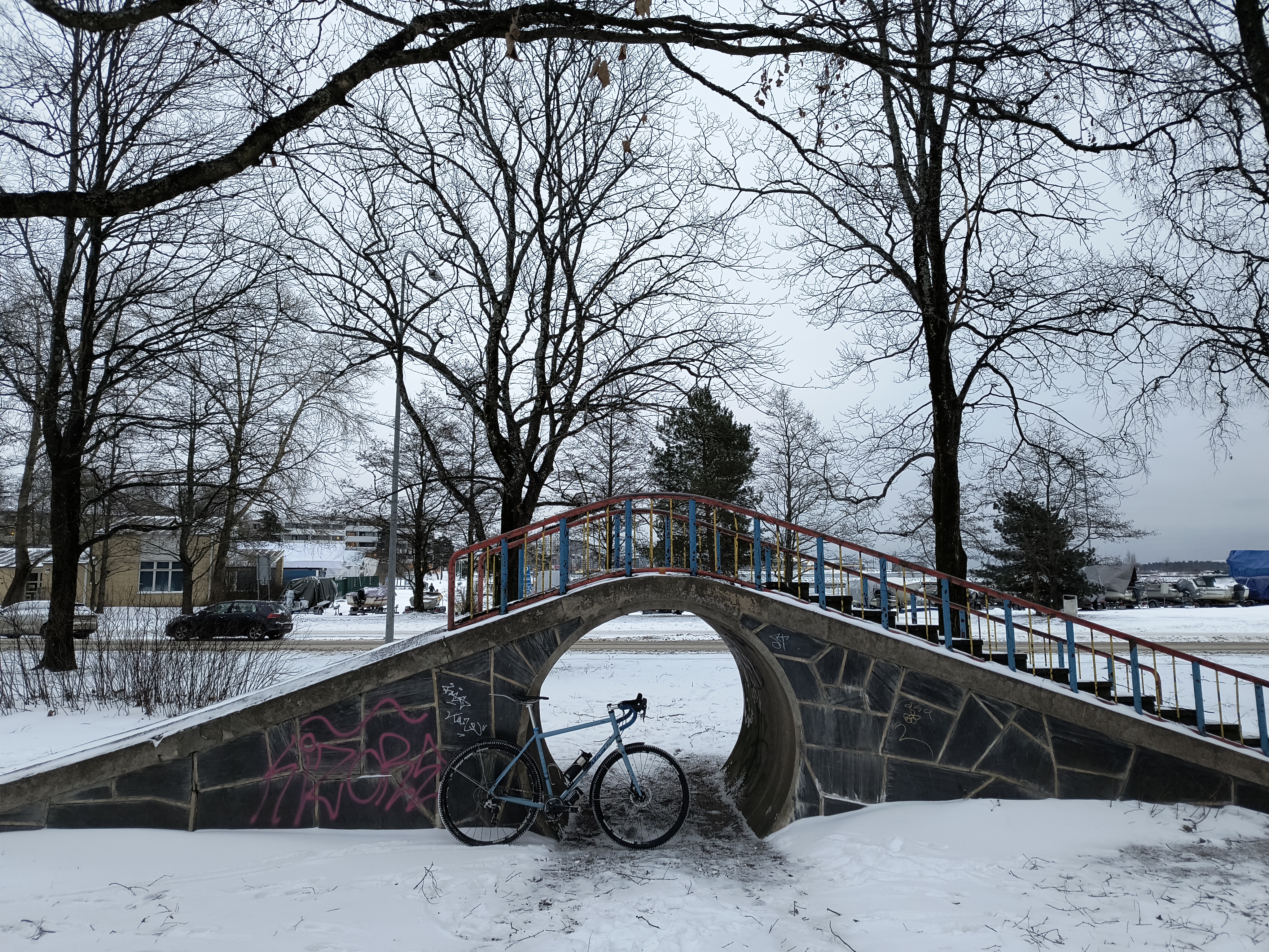 Silta Postintaival-kadulla. Rasti 2558. Tuulenpuuskia riitti ja edes suht skarpin kuvan ottaminen vaati yrittämistä.