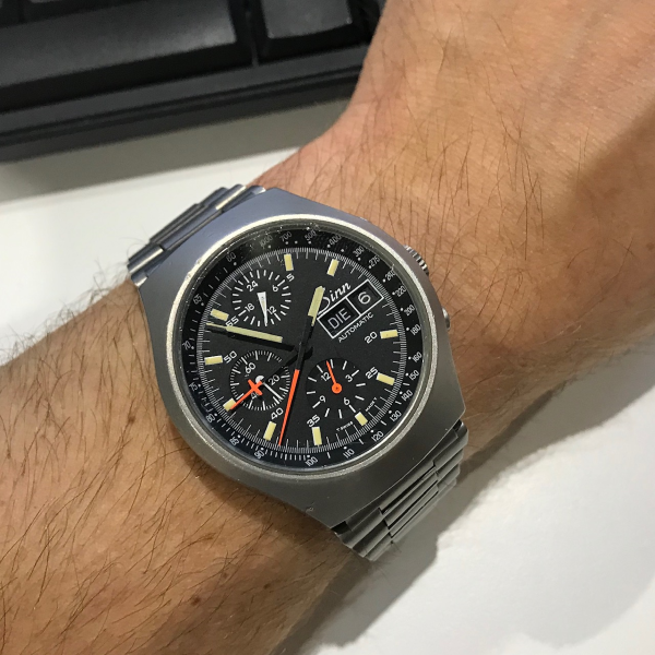 Lemania 5100-koneistolla, keskeinen osoitin ajanoton minuuteille on ihan parhautta.